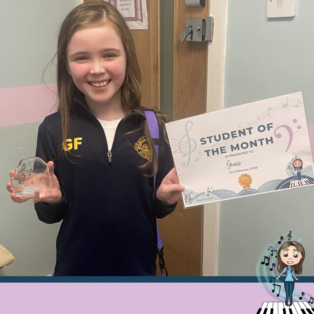 Grace, a singing student, is February’s Student of the Month for her dedication to practice and lesson preparation.